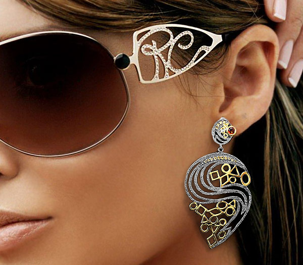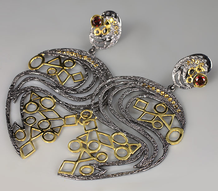 Серьги из черненого стерлингового серебра 925 пробы с гранатами и цитринами. Вес — 14,9 гр. Размер серег — 73×37 мм. Выборочное золочение.