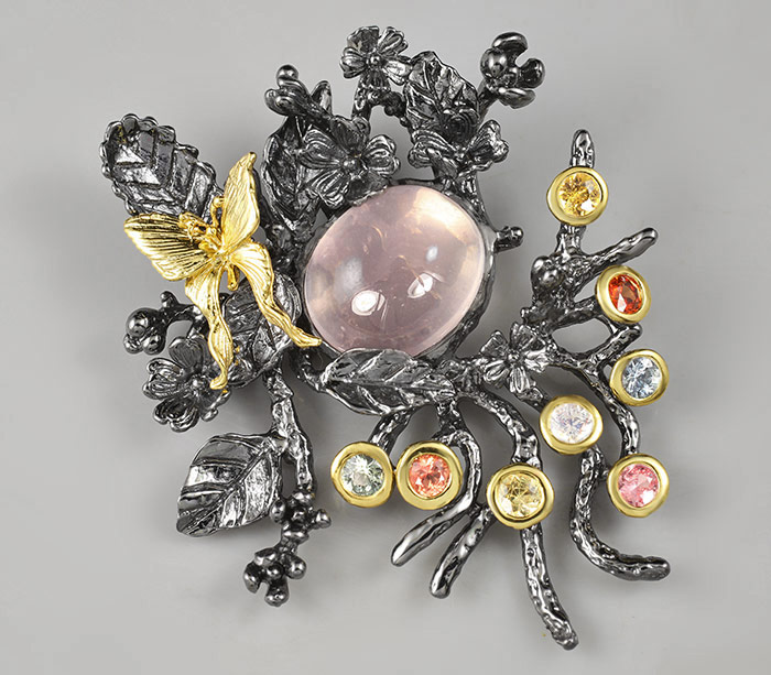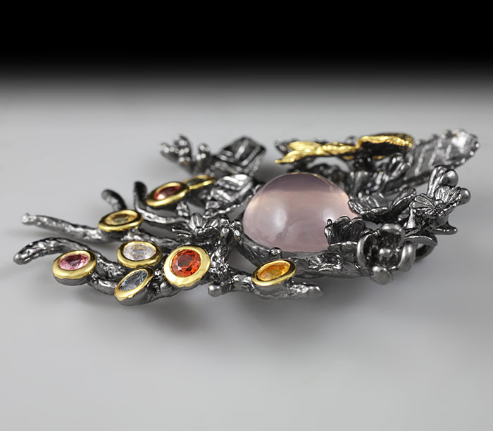 Кулон из черненого стерлингового серебра 925 пробы с розовым кварцем и разноцветными сапфирами. Вес — 25,7 гр. Размер кулона — 61×49 мм. Выборочное золочение.