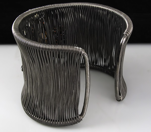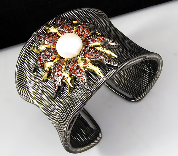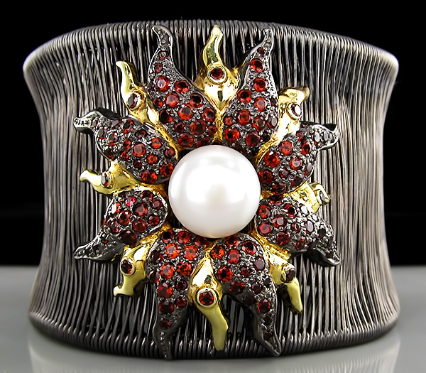 Браслет из черненого стерлингового серебра 925 пробы с жемчужиной (11 мм) и гранатами. Вес браслета — 93,1 гр. Размер площадки — 50×43 мм. Выборочное золочение.