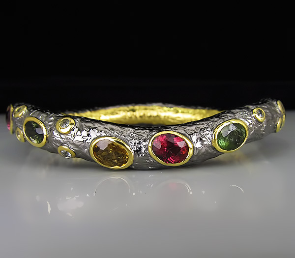 Браслет из черненого стерлингового серебра 925 пробы с разноцветными турмалинами (6×4 мм) и зелеными сапфирами. Вес — 44,3 гр. Размер площадки — 80×10 мм. Выборочное золочение.
