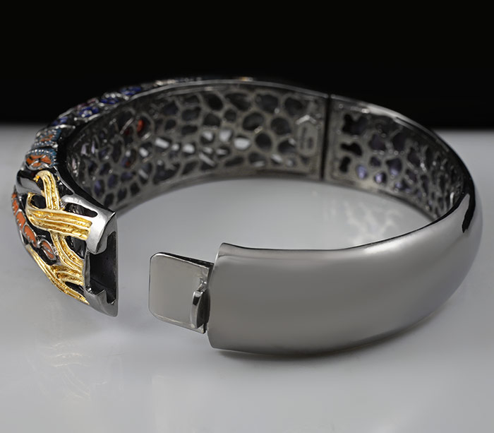 Браслет из черненого стерлингового серебра 925 пробы с розовым кварцем, топазами, цитринами и сапфирами. Вес браслета — 64 гр. Площадка браслета — 76×23 мм. Выборочное золочение и покрытие эмалью.