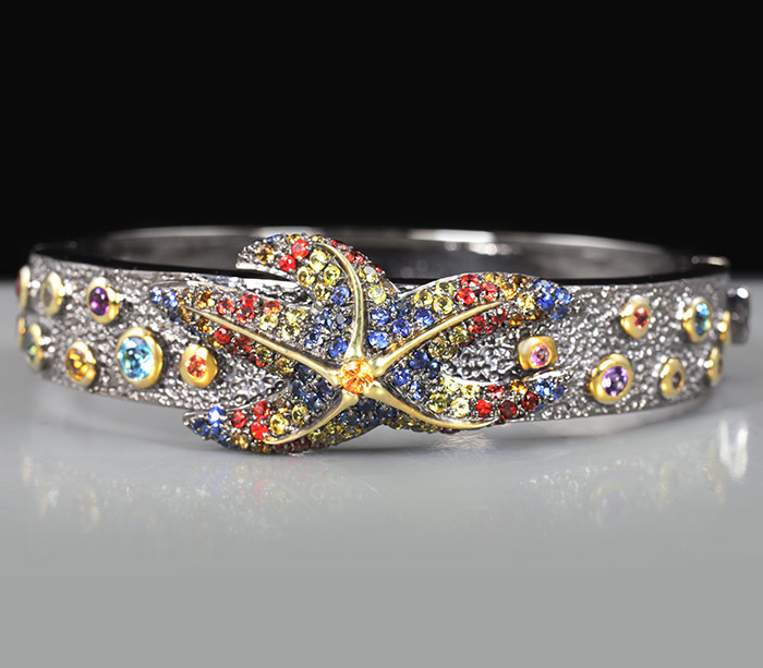 Браслет из черненого стерлингового серебра 925 пробы с цитринами, топазами, аметистами и разноцветными сапфирами. Вес браслета — 40 гр. Площадка браслета — 70×18 мм. Выборочное золочение.