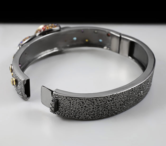 Браслет из черненого стерлингового серебра 925 пробы с перидотами, цаворитами и мозамбикскими гранатами. Вес браслета — 34,2 гр. Площадка браслета — 70×22 мм. Выборочное золочение.