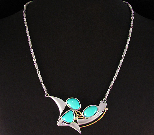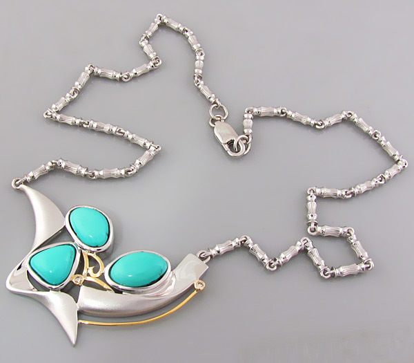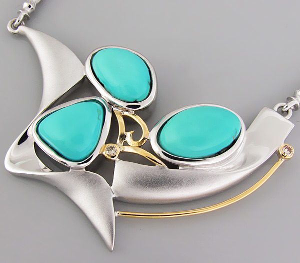 Вашему вниманию предлагается колье из стерлингового серебра (925 проба) с голубой бирюзой и 2 бриллиантами! Подвеска колье частично матирована. Оправа бриллиантов и декоративные элементы изделия выполнены из золота 585 пробы. Раскладывается в линию. Длина по крупной оригинальной цепочке 455 мм. Ширина цепочки 4 мм. Вес изделия 38,9 г. Ниже приводятся размеры вставок.
