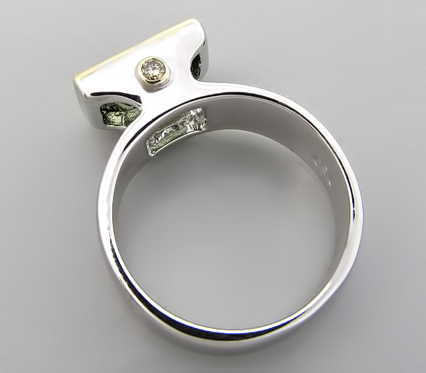 Кольцо из родированного стерлингового серебра 925 пробы с зеленым турмалином и 2 бриллиантами. Выборочное матирование. Оправа бриллиантов и декоративные элементы выполнены из золота 750 пробы. Размеры вставок 2 мм и 10×6 мм. Площадка 12×9 мм, высота 8 мм. Вес изделия 5,9 гр. Размер 17,25.