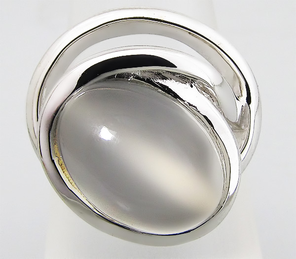 Кольцо из родированного стерлингового серебра 925 пробы с лунным камнем. Размеры вставки 14×10 мм. Площадка 20×20 мм, высота 14 мм. Вес изделия 9,7 гр. Размер 17,75.