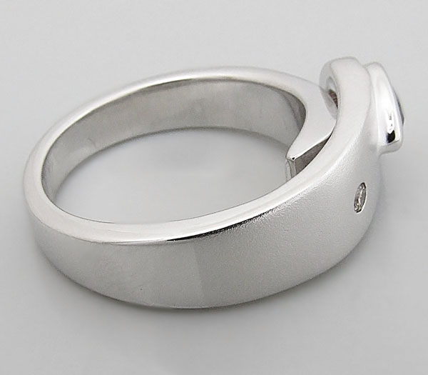 Кольцо из родированного стерлингового серебра 925 пробы с розовым турмалином и бриллиантом. Выборочное матирование. Размеры вставок 2 мм и 7×4 мм. Ширина площадки 8 мм, высота 7 мм. Вес изделия 8,9 гр. Размер 18,25.