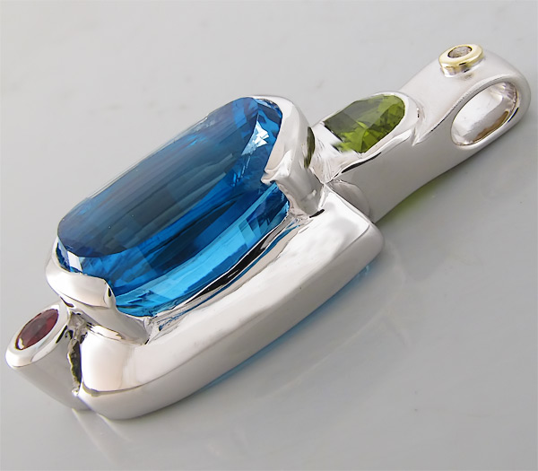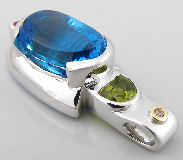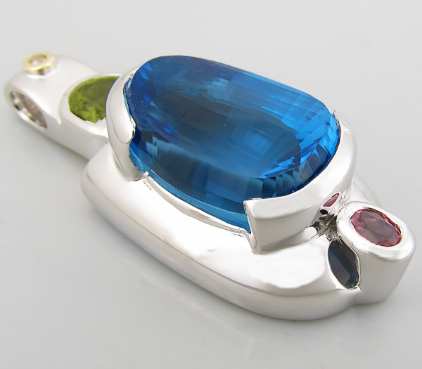 Кулон из стерлингового серебра 925 пробы с топазом авторской огранки, розовым и зеленым турмалинами, и бриллиантом. Изделие частично матировано. Оправа бриллианта выполнена из золота 750 пробы. Размеры вставок 2 мм и 18 х 13 мм. Площадка кулона 43 х 18 мм. Вес 18,7 г.