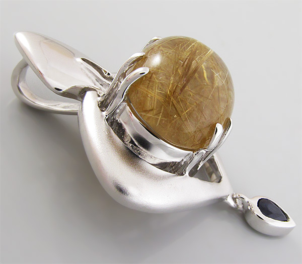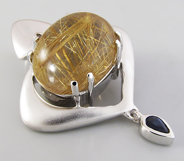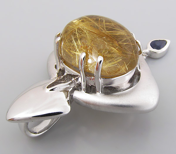 Кулон из стерлингового серебра 925 пробы с кабошоном рутилового кварца и синим сапфиром. Изделие частично матировано. Размеры вставок 6 х 3 мм и 20 х 15 мм. Площадка кулона 50 х 34 мм. Вес 23,4 г.