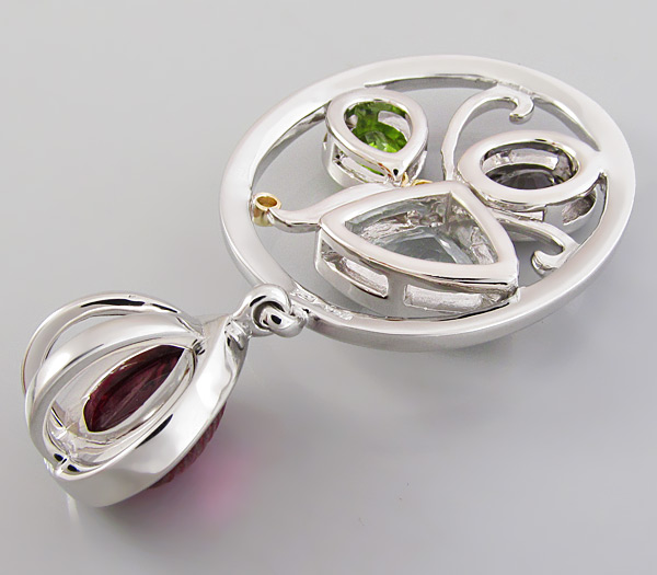Кулон из стерлингового серебра 925 пробы с резным пурпурным турмалином, голубым аквамарином, желтовато-зеленым перидотом, дымчатым турмалином и бриллиантами. Размеры вставок от 8 х 6 мм до 11 х 11 мм. Размеры кулона с петлей 60 х 34 мм. Вес 24,5 г.