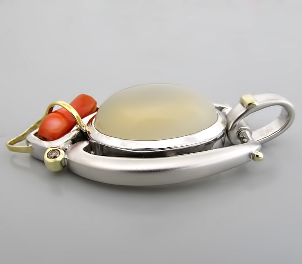 Кулон из родированного стерлингового серебра 925 пробы с лунным камнем, кораллом и бриллиантом. Выборочное матирование. Оправа бриллианта и декоративные элементы выполнены из золота 750 пробы. Размеры вставок от 2 мм до 22×16 мм. Размеры кулона с петлей 53×29 мм. Вес 24,1 гр.