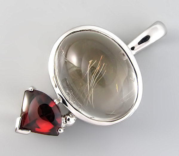 Кулон из родированного стерлингового серебра 925 пробы с рутиловым кварцем и ярким гранатом. Размеры вставок 11×8 мм и 20×15 мм. Площадка кулона 39×22 мм. Вес 13 гр.