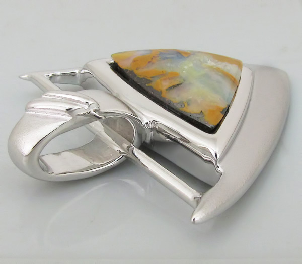 Кулон из родированного стерлингового серебра 925 пробы с болдер опалом. Выборочное матирование. Основные цвета опалесценции опала: розовый/синий. Размер центральной вставки — 15×11 мм. Площадка кулона 31×28 мм. Вес 8,6 гр.