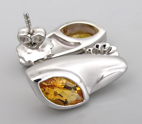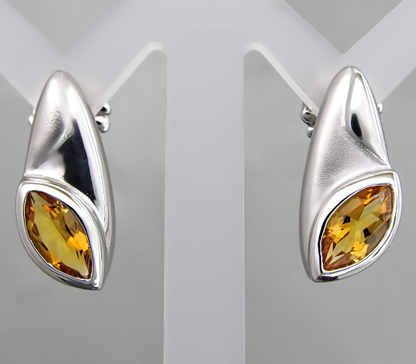 Серьги из родированного стерлингового серебра 925 пробы с цитринами. Выборочное матирование. Размеры вставок 10×5 мм. Площадка серег 21×9 мм. Вес пары 9,3 гр.