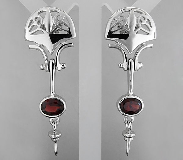 Серьги из родированного стерлингового серебра 925 пробы с гранатами. Выборочное матирование. Размеры вставок 8×6 мм. Площадка серег 53×18 мм. Вес пары 14,7 гр.
