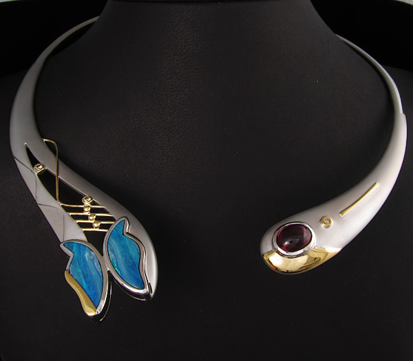 Колье из стерлингового серебра 925 пробы с турмалином, дублет опалами и бриллиантами. Изделие частично матировано. Оправа вставок и декоративные элементы выполнены из золота 750 пробы. Размеры вставок от 1 мм до 26 х 8 мм. Длина по окружности 450 мм. Вес изделия 100 г